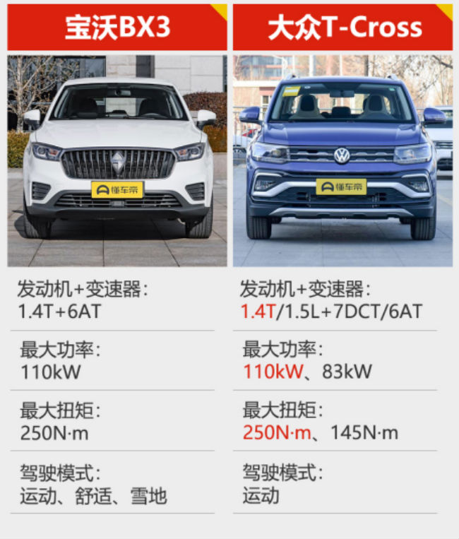 德系品牌素以动力总成技术领先而闻名,尤其是大众之前率先引入的缸内直喷、涡轮增压以及双离合变速器等技术而逐渐成为国内消费者心目中的“神车”。不过对比宝沃BX3所使用的1.4T发动机和T-Cross的1.4T发动机,就会发现两款发动机的最大功率和最大扭矩的数据完全一致。