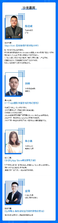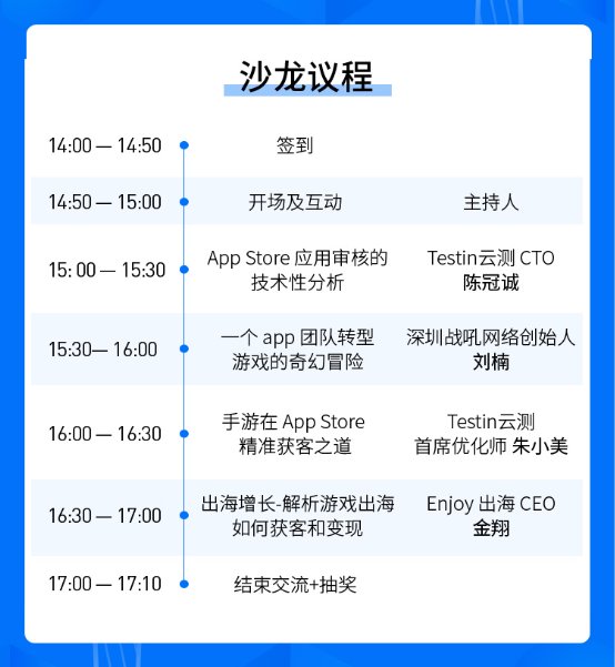 Testin云测CTO将亲临现场与嘉宾分享应用商店技术性分析与解密,深圳战吼网络创始人刘楠亲历手游转型实战分享,更有优质出海企业EnjoyCEO解密手游出海高阶技巧。嘉宾以过来人角度跟你探讨,手游推广的正确姿势,手游蓝海的准确定位,审时度势的执行技巧,以及本土手游出海策略的制定与落地。同时,每个分享内容都配备答疑时间,保证每一个到场的小伙伴收获满满。