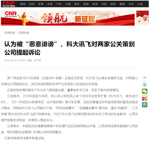 科大讯飞高级副总裁、董事会秘书江涛表示,2018年底至今年初,有公关公司在网上多个资讯平台发布扩散《科大讯飞:裁员进行时》、《又一科技巨头跌落神坛!这次是安徽》等不实文章,这些文章通过对来自互联网的匿名信息进行聚合,并糅合科大讯飞公司股价下跌、“同传误读事件”、“观塘基地事件”等内容,通过“标题党”、“二次洗稿”等方式对科大讯飞进行抹黑攻击,干扰了科大讯飞正常经营活动并形成了恶劣的社会影响,公司为维护自身合法权益,向侵权人提起诉讼。目前,相关案件法院已经正式立案,案件具体细节暂不方便透露。