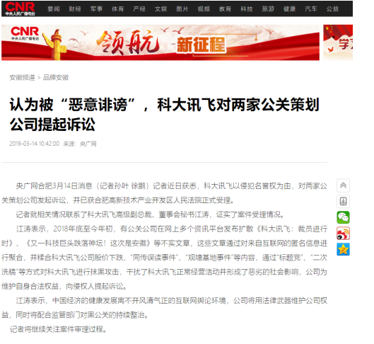 江涛表示,2018年底至今年初,有公关公司在网上多个资讯平台发布扩散《科大讯飞:裁员进行时》、《又一科技巨头跌落神坛!这次是安徽》等不实文章,这些文章通过对来自互联网的匿名信息进行聚合,并糅合科大讯飞公司股价下跌、“同传误读事件”、“观塘基地事件”等内容,通过“标题党”、“二次洗稿”等方式对科大讯飞进行抹黑攻击,干扰了科大讯飞正常经营活动并形成了恶劣的社会影响,公司为维护自身合法权益,向侵权人提起诉讼。