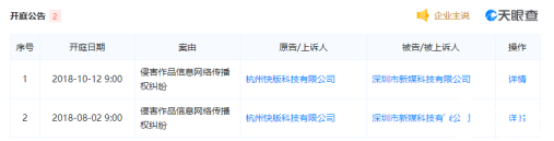 除此次涉嫌侵犯科大讯飞名誉权外,据“天眼查”显示,“深圳市新媒科技有限公司”近期面临的司法纠纷还有两宗,上诉人为杭州快版科技有限公司,起诉日期分别为2018年8月2日和10月12日,起诉案由是“侵害作品信息网络传播权”。