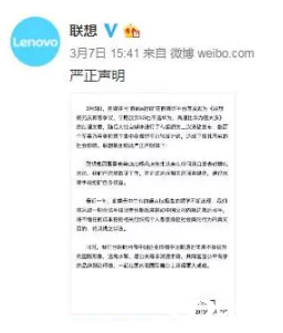 3月7日,联想集团在官微发布声明,称将对涉嫌造谣的数百家自媒体发起诉讼。声明称: