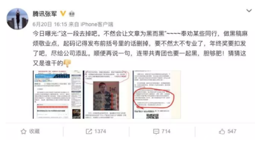 腾讯则在6月20日前就表现要深挖黑公关的意愿。腾讯公司创始人马化腾在朋友圈表示,“若不是这个纰漏,很多人没有意识到黑公关是多么猖獗。近两个月突然爆发,本想一贯佛系忍忍就算了,但是时候挖根源了。”