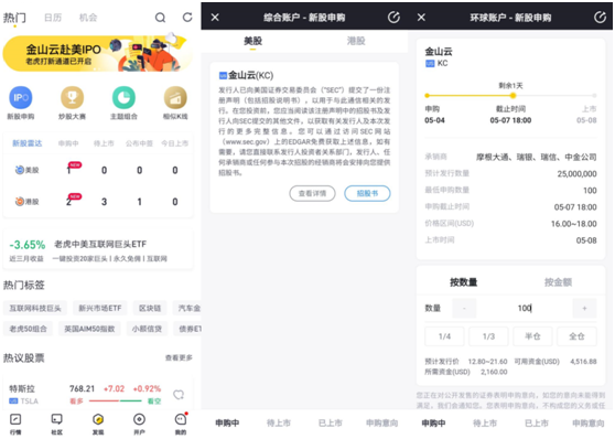 老虎证券相关负责人介绍,目前金山云的打新通道已上线。投资者进入APP Tiger Trade的“新股申购”页面即可点击查看招股书并进行申购,最低申购数量为100股。按照当前的发行价区间计算,打新最低门槛约为2160美元。目前预计金山云将在5月8日上市,其申购通道将在5月7日晚18时关闭。