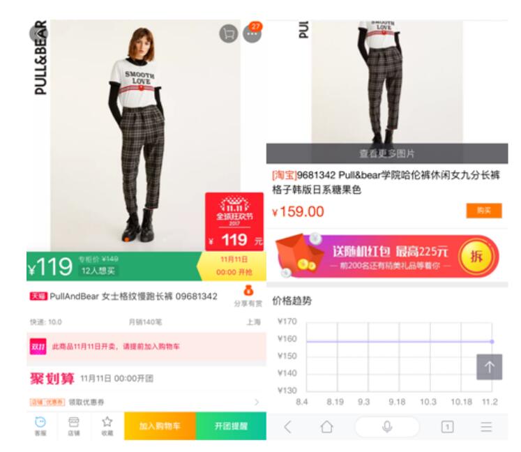 (左图为商品“双十一”的销售价格,右图为“拍照购物”页面90天内的售价)