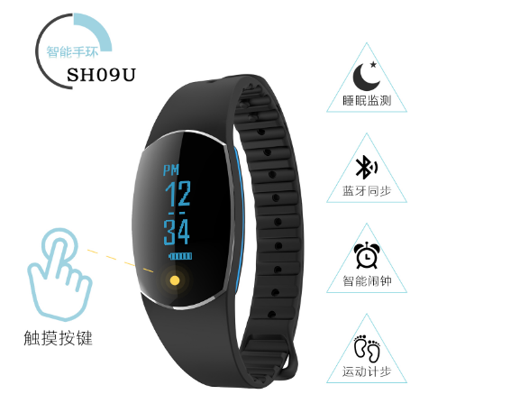 Trasense SH09U 智能手环主打实时监测功能,简单的触摸显示屏可一目了然监测数据,手环与手机连接成功后,可以将数据同步至APP可永久存储监测数据。