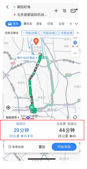 首先,在出行前,车主用百度地图规划路线时,系统将结合官方权威机构数据,展示每条推荐路线的通行费用。便于用户在充分了解费用、距离、耗时等因素的基础上综合考虑,选择最佳路线。