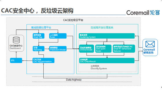 另外,林延中还分析了目前邮件运维面对的挑战以及CAC安全中心的应对措施。CAC数据中心和离线处理平台对邮件相关数据进行加工处理分析,生成预测模型并下发到在线高并发处理系统,在线高并发处理系统对邮件样本进行实时过滤分析,大幅增强对可疑邮件的过滤判定,综合提升对用户垃圾邮件的拦截率。