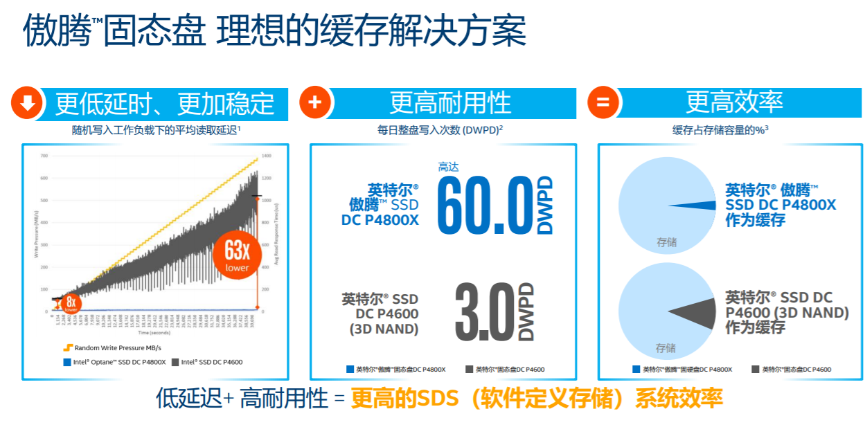 英特尔傲腾固态盘 DC P4800X 还提供比基于NAND的驱动器更低延时和更加稳定的工作负载,以及高得多的耐久性。例如,比较DC P4800X和DC P4600,在随机写入工作负载下的批拟杆菌读取延迟来看,可以实现最大63倍差的低时延。在耐久性方面可以发现英特尔傲腾固态盘 DC P4800X 多达 60 次驱动器写入/天 (DWPD),而基于 NAND 的英特尔固态盘 DC P4600 只有 3 次 DWPD。同时作为缓存DC P4800X在实现更小存储容量占比下,实现更高的效率。
