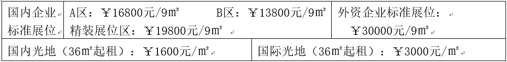 1、标准展位9m?(3m×3m);配置:展出场地、三面展板(高2.5m)、一块中英文楣板 、一 张洽谈桌、二把椅子、地毯、220V电源、二支射灯。双开口位置另外加收10%的参展费用。