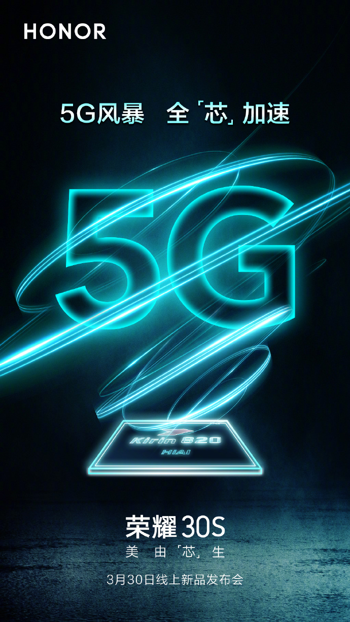 立足于全新一代自研芯片麒麟820,荣耀30S不但为用户带来最强的5G能力和体验,更兼顾超强影像和潮流颜值。荣耀30S拥有旗舰级的ISP 5.0以及业界领先的BM3D单反级图像降噪技术,助力用户记录美好生活。同时,荣耀30S传承数字S系列蝶羽设计语言,工艺升级,带来全新的3D蝶羽光效,潮美进阶。