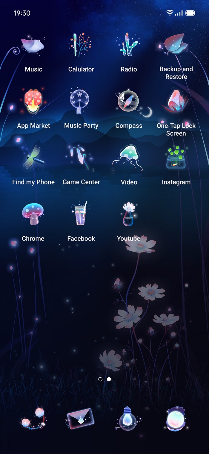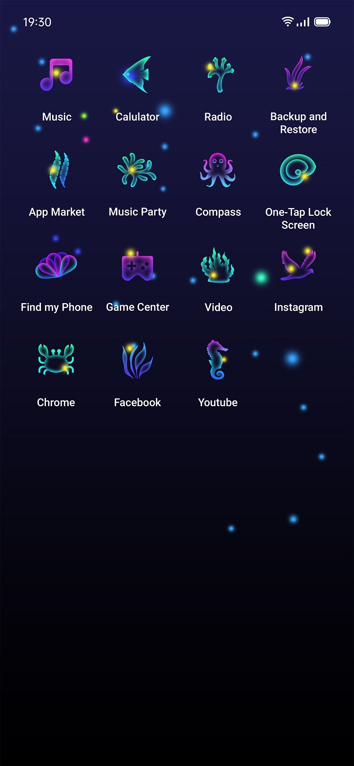 好奇猫Curious Cat发现OPPO用户对于可爱风格的主题接受度很高的特点,结合东南亚人比较喜好荧光效果,创作的《sea world》用深色为底,配以发光的植物和动物,同时加入小气泡和荧光粒子来营造海洋的感觉,让人感受的宁静的同时,又不会过于死板。