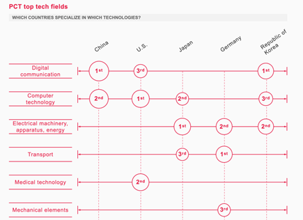 近年来,中国的PCT专利申请量日趋强劲,尤其是在数字通信、计算机领域。在WIPO公布的2019PCT专利申请数据中,各大技术领域中计算机技术占总数的8.7%,在已公布的PCT申请中所占份额最大,其次是数字通信为7.7%,电机制造为7%,医疗技术为6.9%和测量技术为4.7%。其中,在十大技术中,半导体专利申请增长12%、计算机技术专利增长11.9%,这两大技术领域是2019年增长率最高的领域。