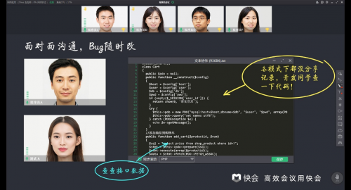 进行一场多人会议时,使用快会进行线上演示的效果极佳。快会支持PPT文档的动画播放,无需共享屏幕,即可流畅播放PPT。会议过程中,所有人都可以上传需要展示的Word、PPT、图片、音视频,实时同步给与会人员。展示者可通过各种颜色的画笔、激光笔、下划线等工具,划出重点,很好地解决了远程演示中信息精准传达的问题。