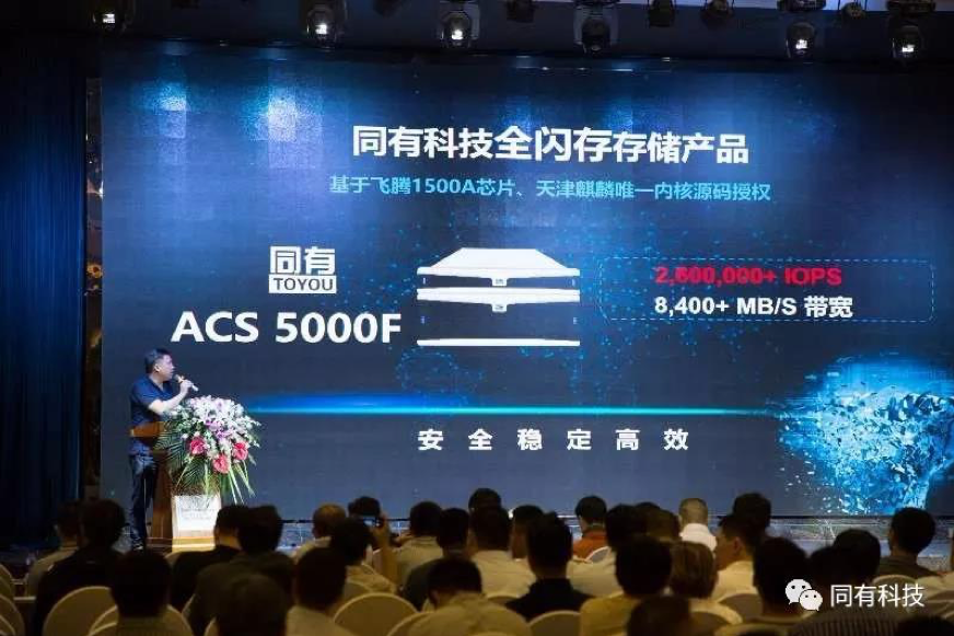 同有科技正式发布的ACS 5000F全闪存存储系统,采用飞腾FT-1500A处理器、银河麒麟内核源码授权和同有科技自主研发的软硬件平台,结合国产主流SSD盘,实现了从硬件到软件层面真正的全国产。ACS5000F为用户多种关键应用及高性能应用而设计,也是国产服务器首选的存储设备,可以为军工、党政、科研院所、金融、能源、教育等各行各业提供性能卓越、安全稳定的存储服务。飞腾副总经理张志群、麒麟副总经理付清朝与同有科技副总经理仇悦在会上共同启动ACS 5000F发布仪式。