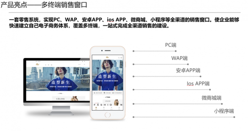 一套零售系统实现PC、WAP、安卓APP、iOS APP、微商城、小程序等全渠道的销售窗口,使企业能够快速建立自己电子商务体系,覆盖多终端,一站式完成全渠道销售的建设。
