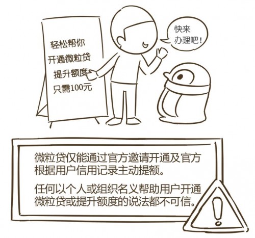 在这里再次提醒用户朋友,目前有且只有通过官方邀请才能开通微粒贷,也仅有官方可以根据用户信用情况主动调整额度,其他一切有偿提供此类服务的均属于不实内容。同时还需注意的是,微粒贷除收取借款的利息和逾期不还的罚息外,从未收取任何手续费、操作费等额外费用,请大家及时辨别虚假信息,谨防上当受骗。