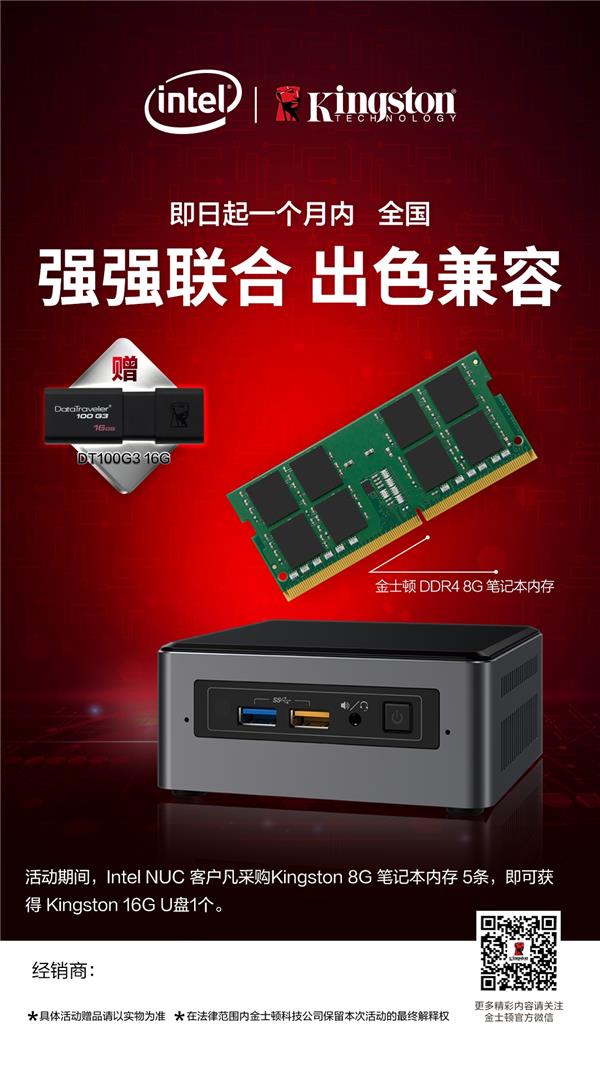 即日起一个月内,中国大陆范围内的英特尔NUC用户购买 5条 金士顿 ValueRAM DDR4 8GB 笔记本内存,即可获赠 1个 金士顿 DT 100G3 16GB U盘。详情请咨询金士顿区域销售王经理,电话:186-0029-8800。