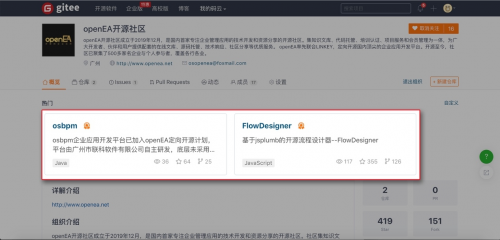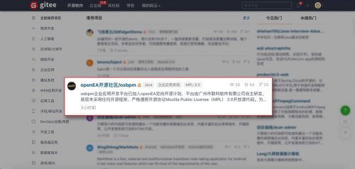 目前,osbpm已正式加入openEA定向开源计划,严格遵照开源协议Mozilla Public License(MPL) 2.0开放源代码。并在Gitee及GitHub同步上线,短短一周,便受到了oschina及Gitee创始人的关注,被推荐至Gitee首页!