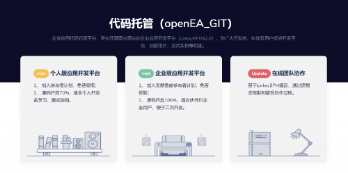 openEA率先联合LINKEY,推出定向开源的国内顶尖企业应用开发平台(osbpm)。osbpm基于LINKEY的流程应用产品,经过十多年发展,在国内几百家大中型企业得到验证,包括深圳华为,新华三,成都飞机,广东移动,云南移动,广东联通,四川电信,广州石化等等。
