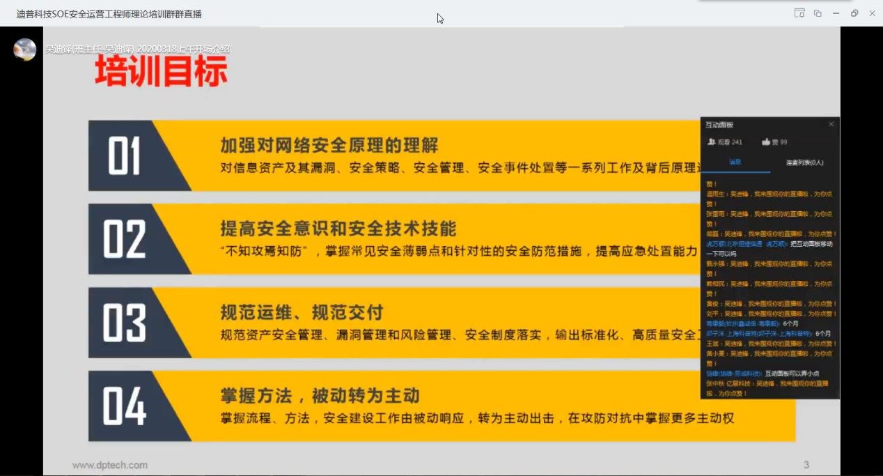 防疫期间,为加强合作伙伴网络安全原理的理解,提高合作伙伴安全意识和安全技术技能,提升规范运维及规范交付能力,迪普科技在2020年3月18日-3月22日举办线上直播课程。来自全国113家合作伙伴共259名人员报名参加理论培训,最终167人通过线上理论部分培训考核,从而获得线下实操培训的机会,为网络安全培养储备军。