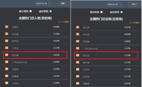 从省份来看,当日广东省的人口迁入迁出比例仍位居全国各省首位,迁入比例榜的第二名和第三名分别是江苏省和山东省;而迁出比例榜的第二名和第三名分别为江苏省和四川省。当日湖北省的迁入和迁出比例分别为3.05%和3.13%,较昨日有所下降。