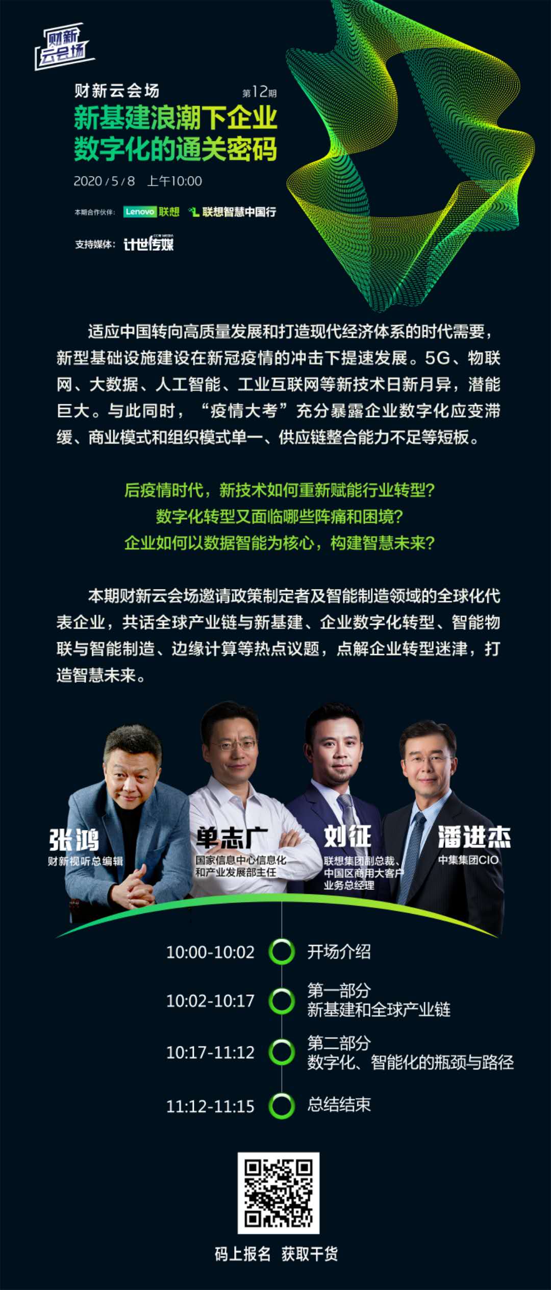 本期财新云会场邀请政策制定者及智能制造领域的全球化代表企业,共话全球产业链与新基建、企业数字化转型、智能物联与智能制造、边缘计算等热点议题,点解企业转型迷津,打造智慧未来。