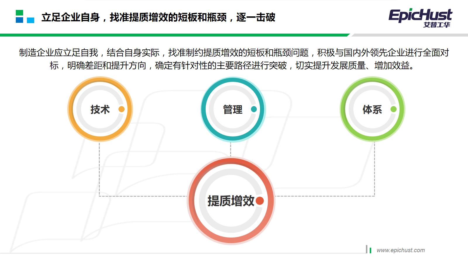 制造企业推进“提质增效”,目的就是要有效控制各项成本,提高生产效率,提升技术、质量和服务水平,创新发展空间,提升市场竞争能力。为此,制造企业应该建立相关的推进团队和机制,引导企业各个部门降本增效、创新生产经营模式增效、市场开拓增效、战略转型增效,全面管理和控制生产经营成本,积极延伸产业链,拓展发展新空间,变革生产经营模式,加快推进创业创新,提高战略应变能力和风险防控能力,全面促进和保障企业提质增效。结合自身的实际情况,找准制约提质增效的短板和瓶颈问题,积极与国内外领先企业进行全面对标,明确差距和提升方向,制定有针对性的主要路径进行突破,切实提升发展质量、增加效益。但是,要明确一点,路径规划一定要清晰,不要贪大求全,要逐一击破、分步实施。大家应该很清楚,生产环节的六要素(人、机、料、法、环、测)和六目标(效率、品质、成本、交期、土气、安全)是管理工作的重点,提质增效依然是围绕六要素和六目标进行推进。