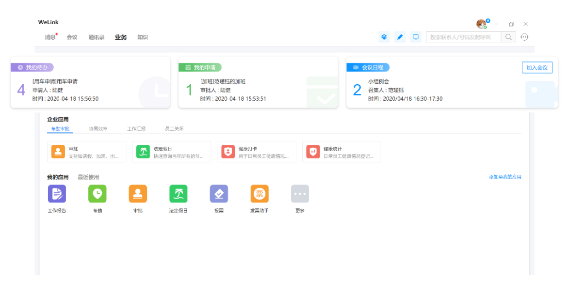华为云WeLink对用户提供了一系列安全接口,在保障企业用户安全的同时,对业务和流程实现了统一深度集成,这次更新,将之前移动端的业务模块,集成到了PC端。用户在PC端即可查看待办、审批、会议日程卡片,使用各类企业应用,访问应用中心。