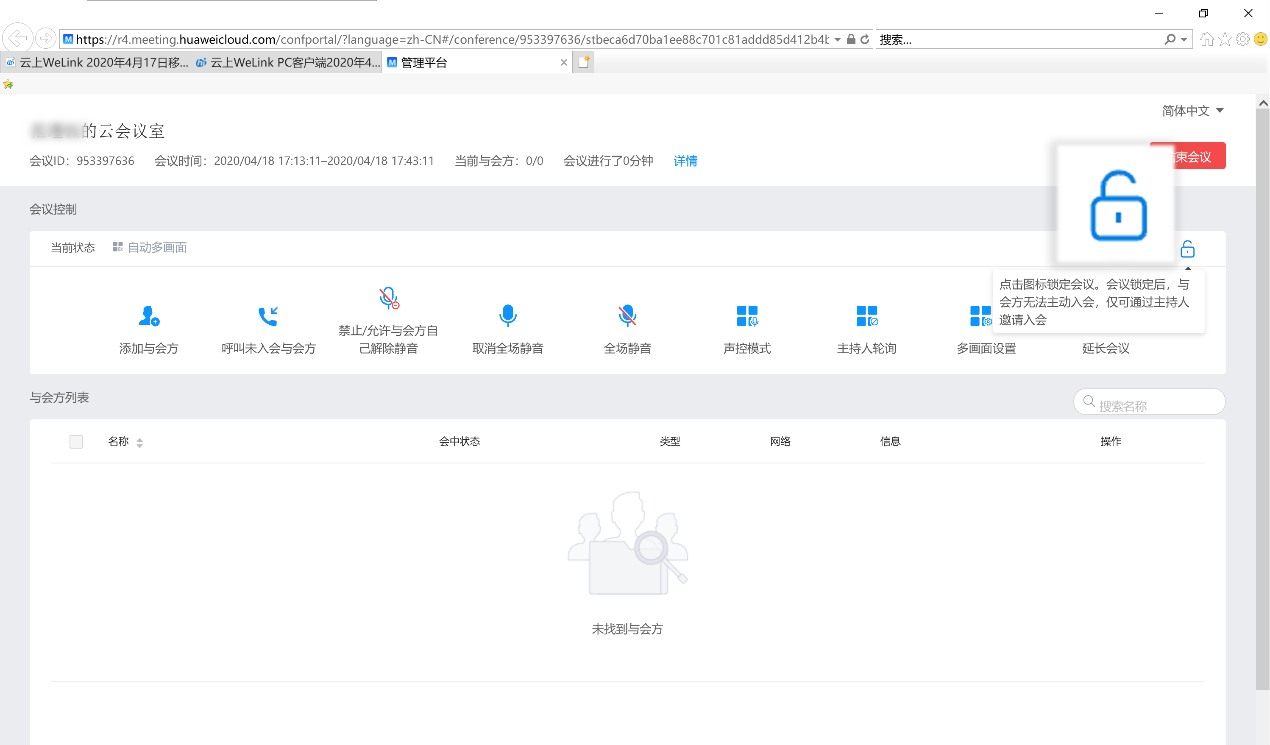 华为云WeLink在进行预约会议时,可以设置“允许入会”的范围,但有时会出现会议已经开始了,才发现忘记进行入会范围设置,又希望排除不相干的人参与会议,于是这次更新的“锁定会议”功能就可以很好的解决这个问题。在Web端会控页面或客户端会控页面,可以找到“锁定会议“按钮,锁定后,仅可通过主持人邀请入会,未被邀请的用户无法主动入会。