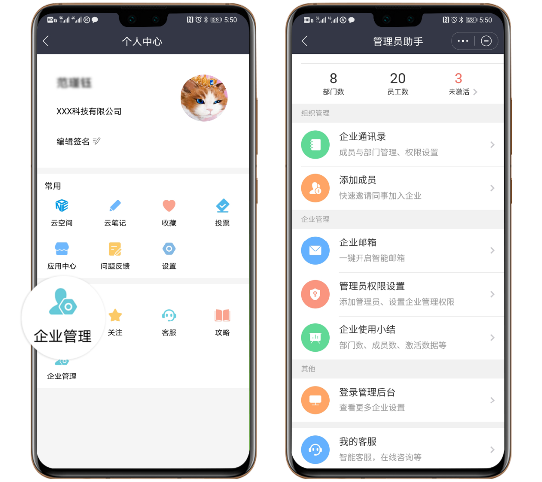 这个新功能无疑对企业管理是非常友好的,进入个人中心,点击“企业管理”菜单,这里集成了企业管理所需所有的管理功能,不仅可以对企业全体成员与部门进行管理和权限设置,还可以对所有管理员和管理员的权限进行设置;“企业使用小结“模块,可以实时展现企业各个部门的使用情况;而且企业管理页面还增加了”我们的客服“入口,方便管理员在管理企业遇到问题时,可以随时访问管理员助手,快速管理企业。