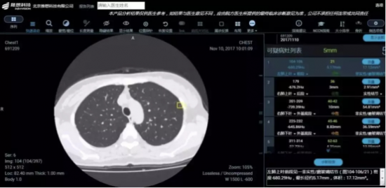 通过推想科技肺癌智能筛查系统,可以在5秒之内读完患者的胸部CT片,并能将可疑部位进行自动标注。医院使用 “AI辅助,人工诊断”这一筛查方式,更加准确地判断、分析病灶,让肺结节筛查更加高效、精准。
