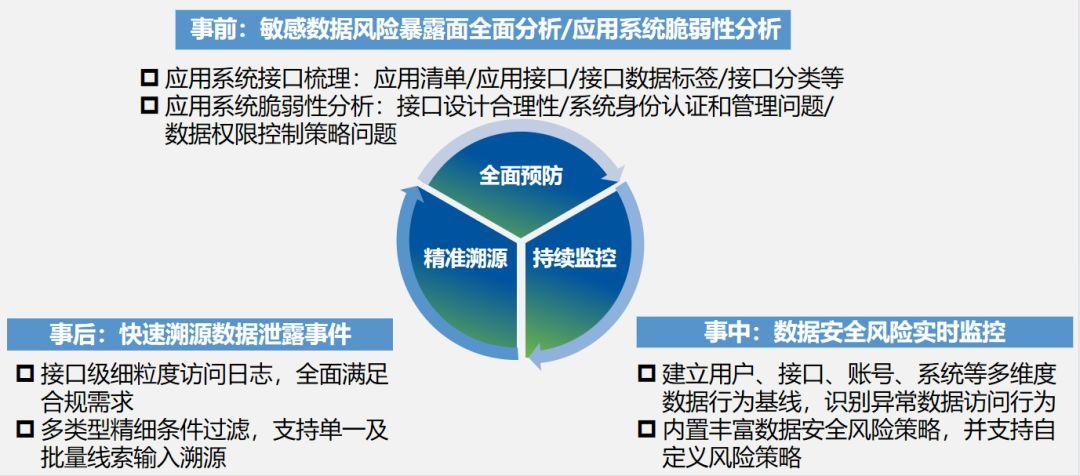 基于上述提及的第五点,应用数据安全防护,深信服提出应用数据安全治理解决方案。方案以数据为中心,聚焦应用系统的流动数据,基于AI和大数据技术,自动化梳理应用数据资产,实时监控应用系统脆弱性及异常数据访问风险,精准溯源数据安全事件,实现数据流动安全风险全面有效治理。
