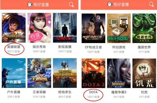 诚然,DOTA2的玩家数量,和英雄联盟比肯定还有不小的差距,其实除了查看数据之外,还有一个佐证——在所有直播都能看的狗仔直播APP上,不管任何时段来看,DOTA2的直播数量都和LOL不在一个量级上。甚至有时候英雄联盟的直播数量,是DOTA2的8倍之多!