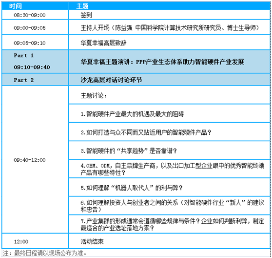 本次活动特邀中国科学院计算技术研究所研究员、博士生导师陈益强作为会议主持人,力邀华为、中兴通讯、富士康、IBM、TCL、百度、酷派、华大基因等知名企业高层,以及数十位智能硬件产业链相关企业副总经理以上高层和战略投资部高层代表参会。