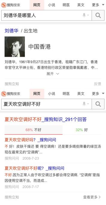 再如,针对“刘德华是哪里人”等客观事实类问题,只需要在搜索引擎的搜索框里输入这一关键词,搜狗“立知”能够提供直接答案“中国香港”。而对于用户经常遇到的观点类难题,搜狗“立知”也可集中体现群体智慧,迅速给出网友观点。譬如用户在检索“夏天吹空调好不好”时,搜狗“立知”即刻给出“68%的网友认为不好,32%的网友认为好”的结果,结合来自搜狗问问的相关问答,供用户参考。