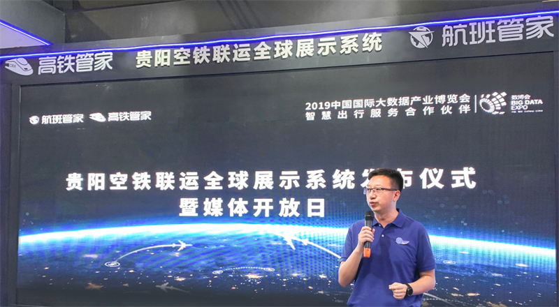 航班管家&高铁管家CEO连长在数博会现场,向媒体介绍贵阳空铁联运全球展示系统
