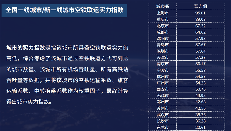 以本次贵阳空铁联运全球展示系统为例,航班管家基于贵阳市的航班高铁运力、机场车站流量、进出时刻数据,以及换乘最长衔接时间、换乘最短衔接时间等各个环节多维度、准确的数据进行综合、加工和计算,不仅展示了贵阳未来一个月通过空铁联运方式可到达的城市数量,还展示贵州省其他城市的空铁联运实力指数。
