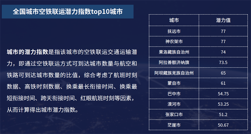 除此之外,航班管家还发布了国内首份《全国城市空铁联运实力指数与潜力指数报告》。一线城市/新一线城市中,上海市以95.01实力值高居榜首,重庆市、北京市以89.03、67.32的实力值分列二、三位,成都、沈阳、青岛、深圳等16个城市的实力值均在60以下;潜力指数top10城市中,抚远市、神农架市、果洛藏族自治州分别以77、77、74的潜力值占据前三,阿拉善额济纳旗、阿坝藏族羌族自治州、蒙自市、巴中市、张家口式、漠河市、茫崖市分列四到十位。