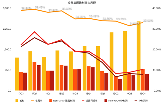 从费用率表现可以看出,营销和研发费用在2019年激增。营销费用的激增主要是因为欢聚集团加大了对海外销售和营销活动的投入,以及在与BIGO合并之后,相关折旧以及摊销带来的影响;研发费用增长主要是因为与BIGO合并后在给予研发人员工资的支出上有所增加,但可以看到在19年二季度销售费用率达到17.5%的最高值后,连续两个季度都在降低,说明欢聚集团在用户增长的同时,也在追求良好的利润。