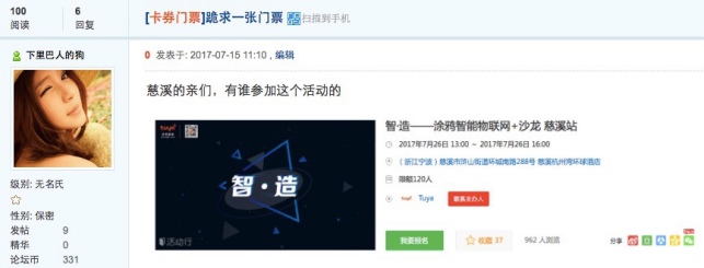 上周,涂鸦智能官方消息披露,本月26日,涂鸦智能将举办第二届“物联网+”沙龙,携手浙商,落地宁波慈溪。消息开出后,慈溪当地知名网站“慈溪论坛”上便出现了某网友求沙龙门票,其他网友出价的一幕。无独有偶,杭州知名网站19楼上也出现了类似的求票帖子。