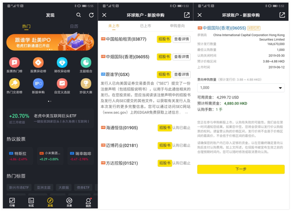 在港股,打新一向非常开放:门槛低且中签率高。另一方面,近年互联网券商的出现也使港股打新更加容易。与传统港股券商不同的是,知名美港股券商老虎证券”一键打新“功能,使投资者通过手机 App 便可一站式完成新股申购操作,整个申购过程不过几分钟。