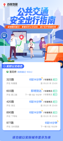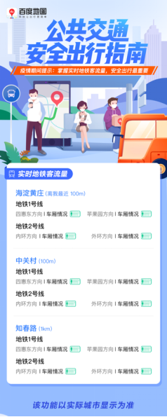 随着如今复工和返程客流逐步增长,公共出行需求进一步释放。不仅各地地铁、公交集团在积极响应疫情防控,百度地图“公共交通安全出行指南”的推出,也将有关疫情期间公共交通出行的相关信息聚合,从出行信息获取到行前决策再到出行服务,这些需求均可通过百度地图一站式满足,共同营造更加安全的出行环境。