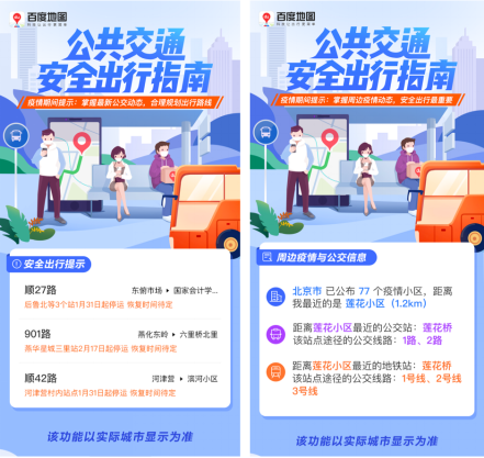 此外,出行指南中还有“周边疫情与公交信息”、“安全出行提示”等功能。前者能够帮助用户直观了解附近出现疫情的地点以及与该地点就近的公交、地铁站,进而提醒用户途径附近时做好防疫工作。据了解,百度地图“疫情小区”专题地图已覆盖261个城市上万个疫情场所。对于后者而言,由于部分公交、个别站点受疫情影响仍在停运,百度地图及时将这类停运信息同步给用户,避免因不知情为出行带来不便。