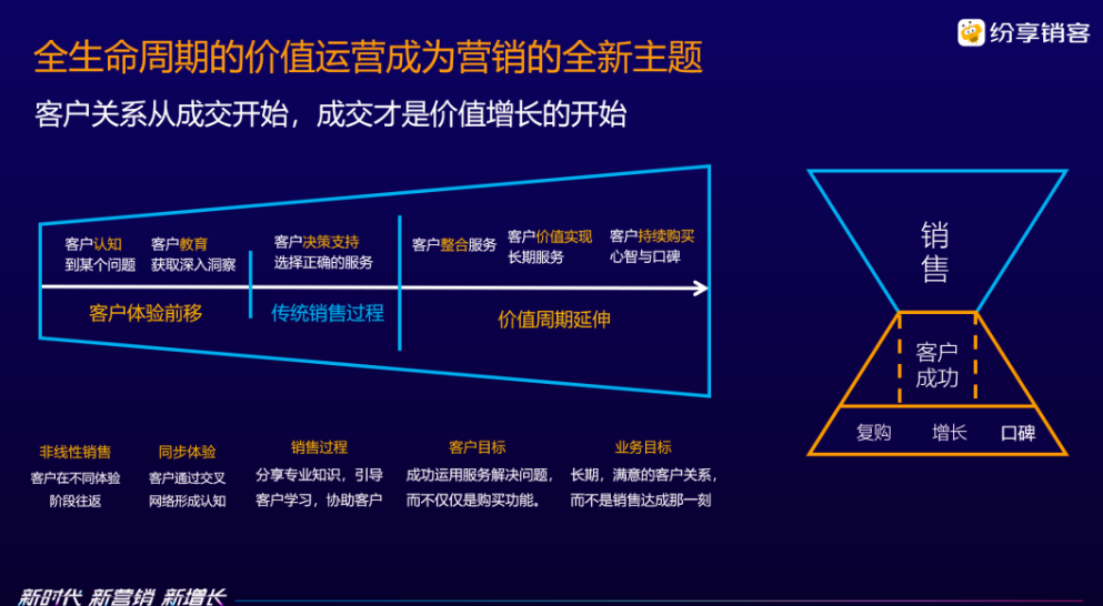 客户全生命周期价值运营理念是新营销时代的主流和主题。企业要将产品和市场的匹配度做到最佳,不断提升用户口碑和美誉度,以客户的成功来定义企业的成功。