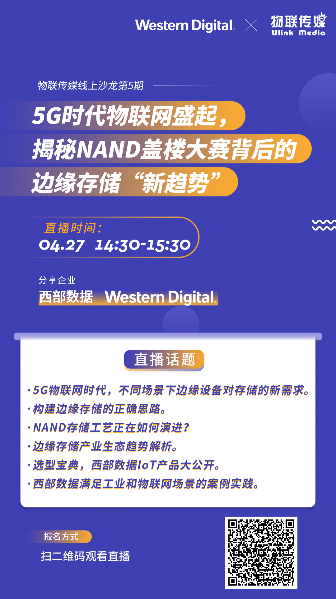 借此机会,全球存储领先企业——西部数据将从分析5G时代物联网产业的趋势变化出发,聚焦边缘存储、工业级eMMC、NAND技术演进等热点话题,为线上观众带来专业的观点分析与产品方案分享,参与者更有机会获得由西部数据赠送的精美价值礼品。