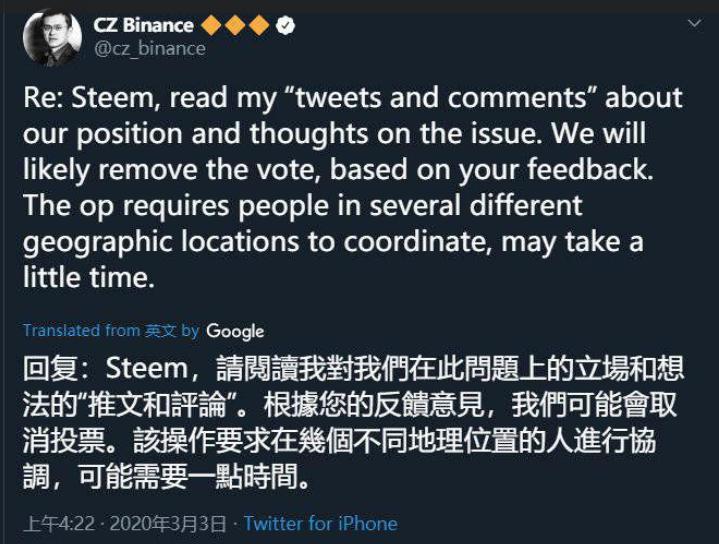 几个小时后,赵长鹏本人回应称以为这是项目常见的升级或硬分叉。但在随后的推文里,他表示币安会取消这次投票,也侧面承认了挪用一事。
