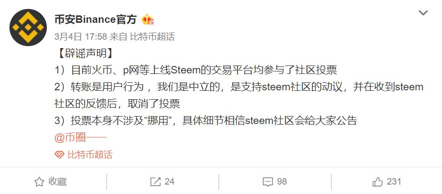 3月2日,币安交易所账户被Steemit社区监控到有约3170万个投票权可能受到操控,Steemit新选出的见证人节点以极少数投票人获得大量投票支持,而幕后操纵者直指币安。