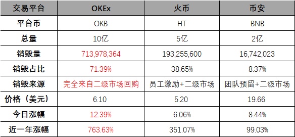 截至目前,OK和火币各自销毁比例为71.39%、38.65%,近一年涨幅分别763%、351%。而币安呢,不仅销毁来源更改成有力内部套现的团队预留,销毁比例近有不到10%,一年里BNB的涨幅还不到100%。