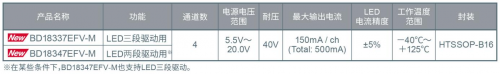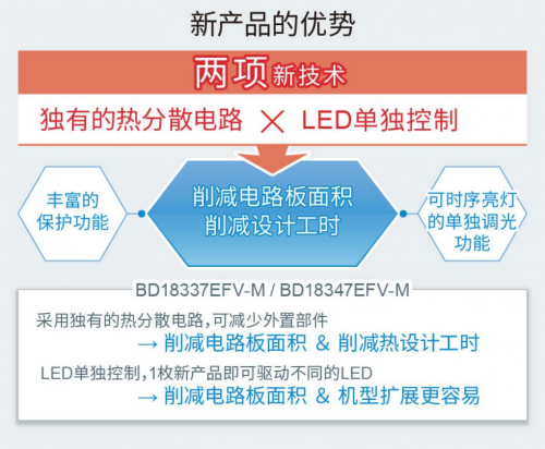 新产品采用了两项新技术:“热分散电路”和“LED单独控制功能”,有助于显著削减LED灯的电路板面积和应用的设计周期。